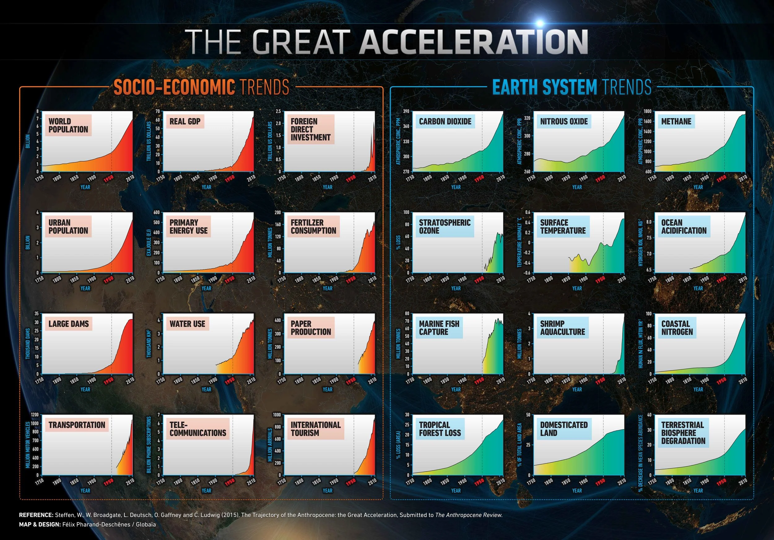 Great Acceleration: A chart showing a range of recent human impacts on earth. From International Geosphere Biosphere Program.